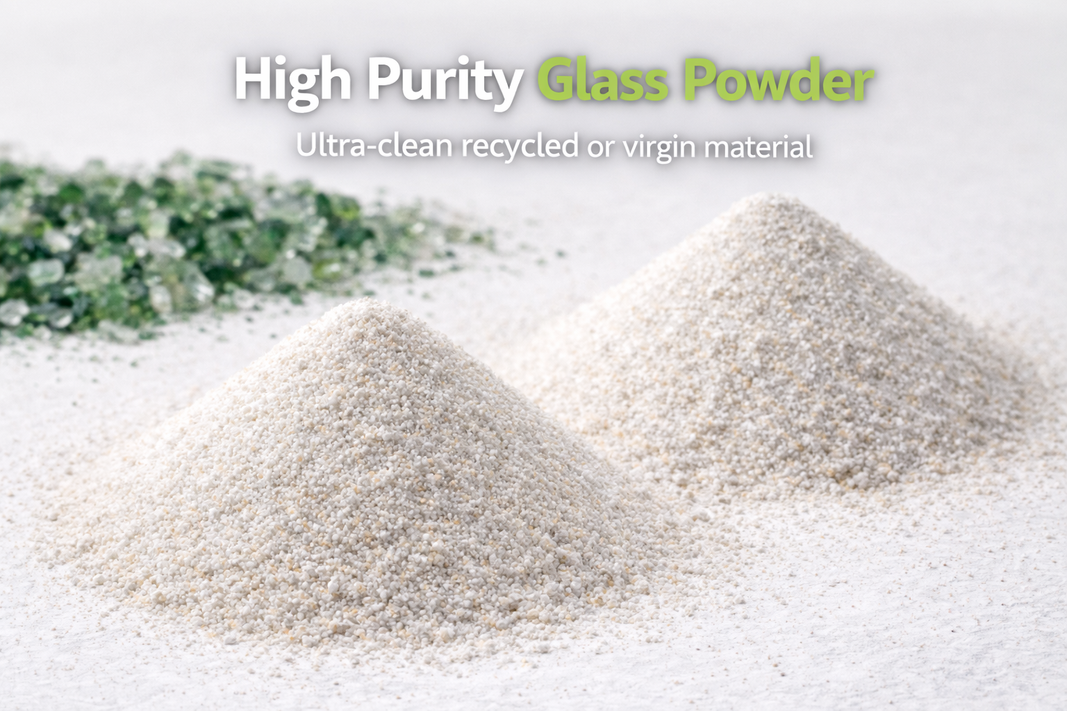 Premium high purity glass powder made from ultra-clean recycled glass. High silica, low contaminants, and consistent fineness for concrete, ceramics, coatings, terrazzo, filtration, and industrial fillers.